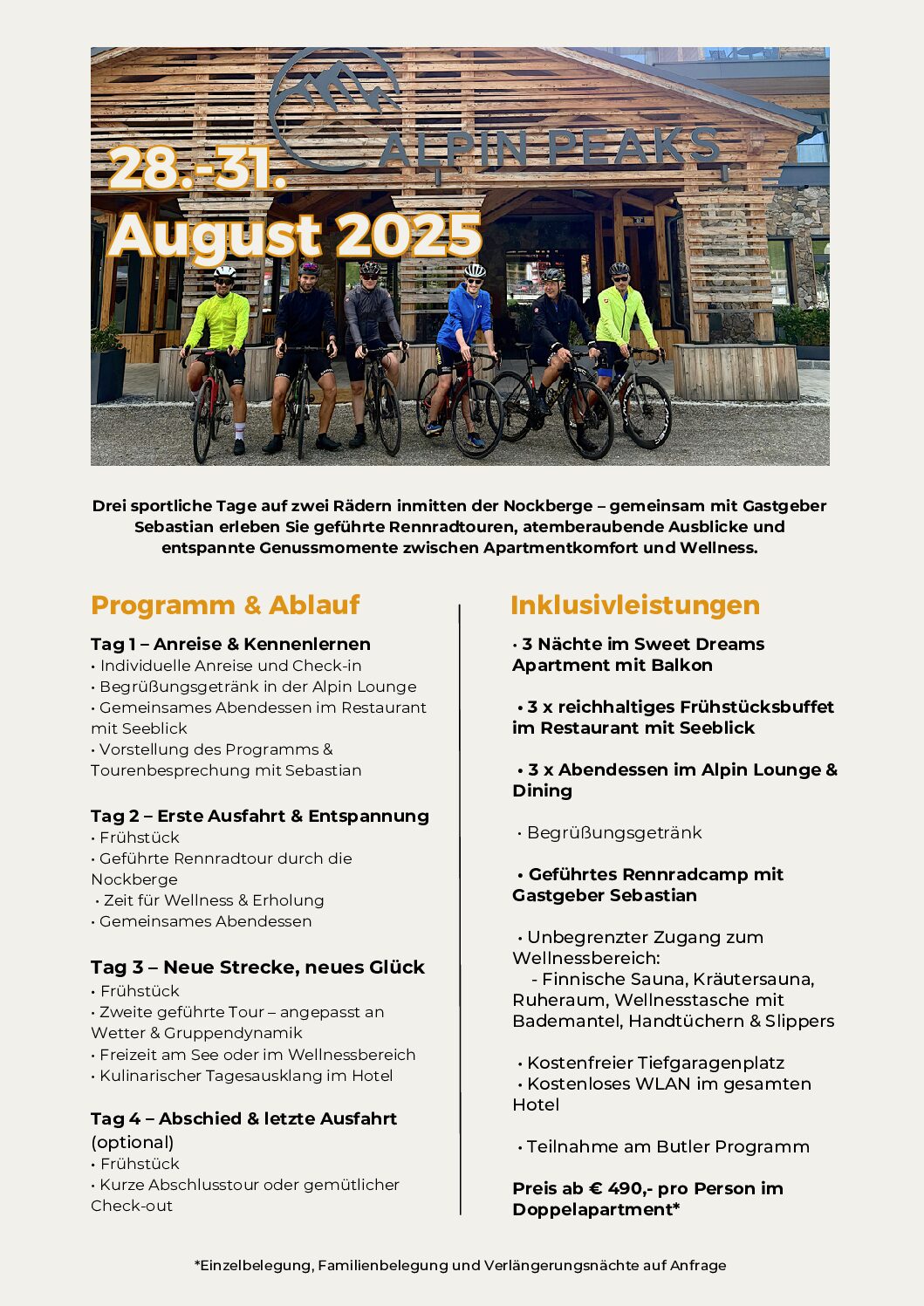 Drei sportliche Tage auf zwei Rädern inmitten der Nockberge – gemeinsam mit Gastgeber Sebastijan Lupša & einem Rennrad Profi aus dem Team Adria Mobil, erleben Sie geführte Rennradtouren, atemberaubende Ausblicke und entspannte Genussmomente zwischen Apartmentkomfort und Wellness.
